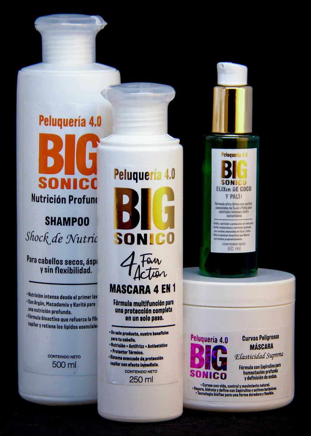 | Este combo aborda la resequedad en rulos. El Shampoo Shock de Nutrición y la Máscara Elasticidad Suprema aportan lípidos y proteínas (Espirulina) para nutrir intensamente. El 4 Four Action y el Elixir de Coco y Palta, con su acción dual, hidratan y sellan la fibra, restaurando la elasticidad, el brillo y la memoria del rizo. |