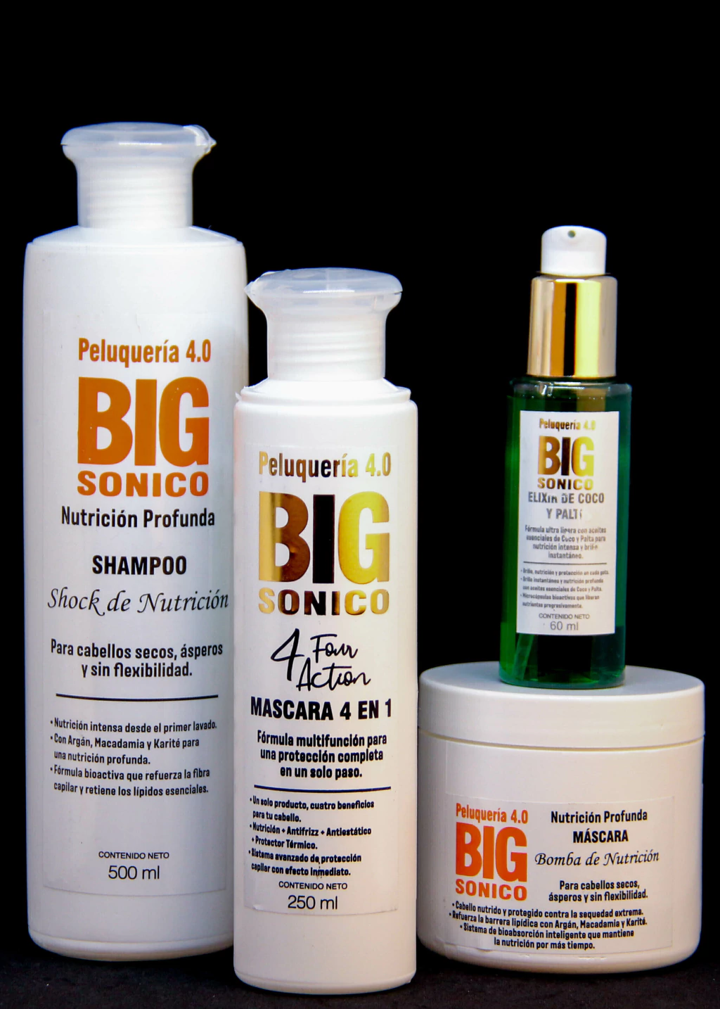 | Este combo nutre y fortalece el cabello natural y las extensiones. El Shampoo Shock de Nutrición y la Máscara Bomba de Nutrición aportan lípidos y proteínas esenciales para la fibra capilar y las extensiones. El 4 Four Action sella y protege. La sinergia mantiene la hidratación y la elasticidad, prolongando la vida útil de las extensiones y su aspecto saludable. |