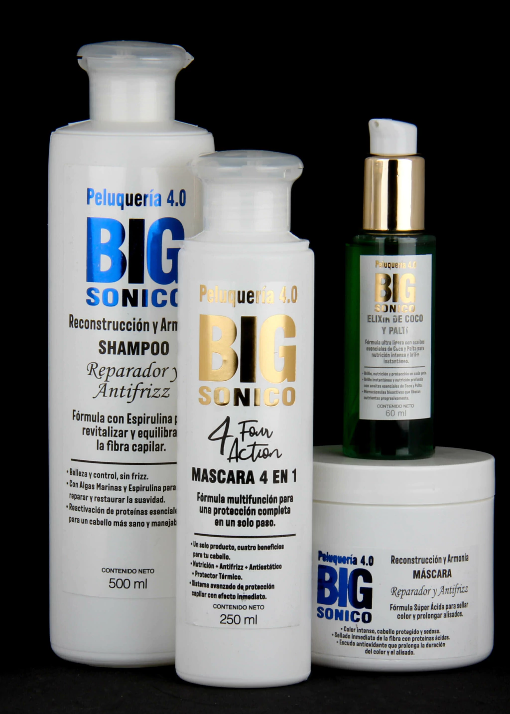 El frizz es tu problema?,Este combo aborda el encrespamiento cronico medianto nutricion profunda y sellado intensivo.El shampoo y Mascara reparacion y antifrizz,con su alto contenidos en Espirulina y otros activos,alisan la cuticula y forman una barrera anti-humedad.El Elixir de coco y palta y el 4 Four Action aportan lipidos esenciales, sellando la fibra y manteniendo la diciplina y el brillo duradero.